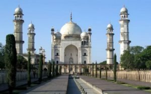 Aurangabad: Maharashtra. Malik Amber, the Prime Minister of Murtaza Nizam Shah II, founded Aurangabad in 1610 A.D. When Malik Amber’s son Fateh Khan, succeeded the throne in 1626 A.D., the city was renamed as ‘Fatehpur’. In 1653, when Aurangzeb became the Viceroy of the Deccan, he made it his capital and renamed it ‘Aurangabad’. Aurangabad is famous for the Bibi-ka-Maqbara, built by Aurangzeb between 1657-1661 A.D. as a tribute to Aurangzeb’s wife, Begum Rabia Durani. It was completed by Aurangzeb’s son Prince Ahmad Shah. The monument is a replica of the famous Taj Mahal. The adjoining Panchakki is an ancient water mill designed in 1595 A.D. by Malik Amber. Khuldabad, near Aurangabad is famous for Aurangzeb’s tomb and the darga of saint Khaja Zainuddin Shirazi. The 18th century Ghrishneshwar Temple, near Aurangabad, is regarded as one of the 12 jyotirlingas in the country. Aurangabad is also famous for the 12th century Daulatabad or Devagiri fort. However, the city derives its fame as a base for the nearby caves of Ajanta and Ellora. The typical arts and crafts of Aurangabad include Paithani saris, Himroo shawls and Bidri work (zinc with silver embedding).